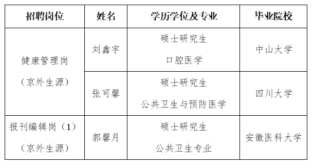 卫生宣传岗(2)(京内生源)、报刊编辑岗(2)(京内生源)无进入笔试人选,经研究取消本次岗位招聘;综合管理岗(京内生源)无进入面试人选,经研究取消本次岗位招聘;卫生宣传岗(1)(京外生源)无进入考察人选,经研究取消本次岗位招聘。
