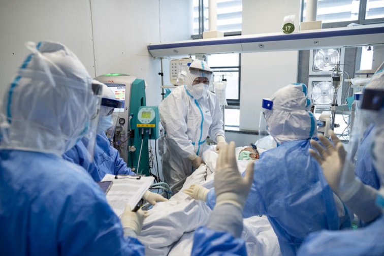 带领医疗团队查看一名新冠肺炎危重症患者情况(2020年4月11日摄)。新华社记者沈伯韩摄